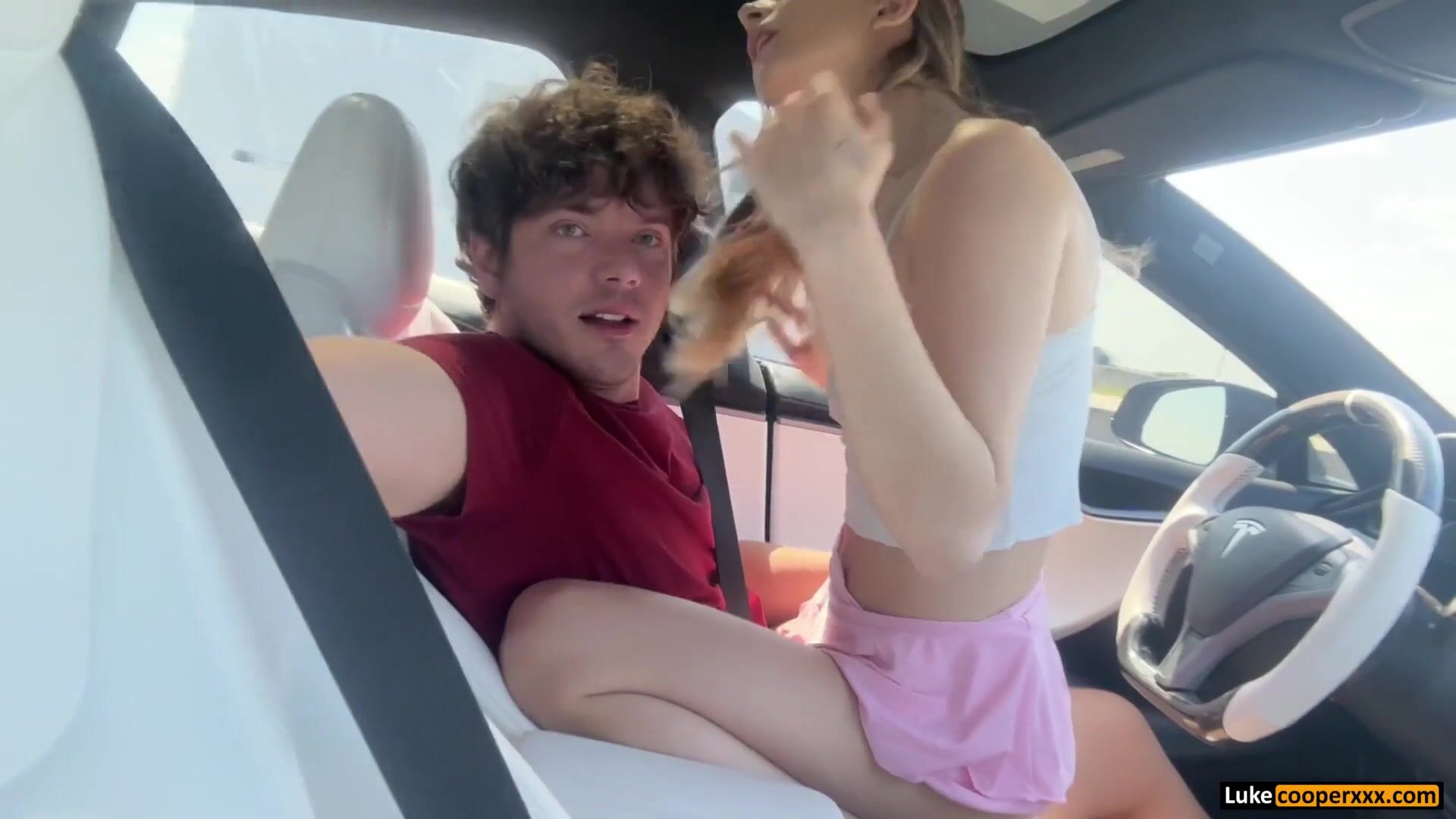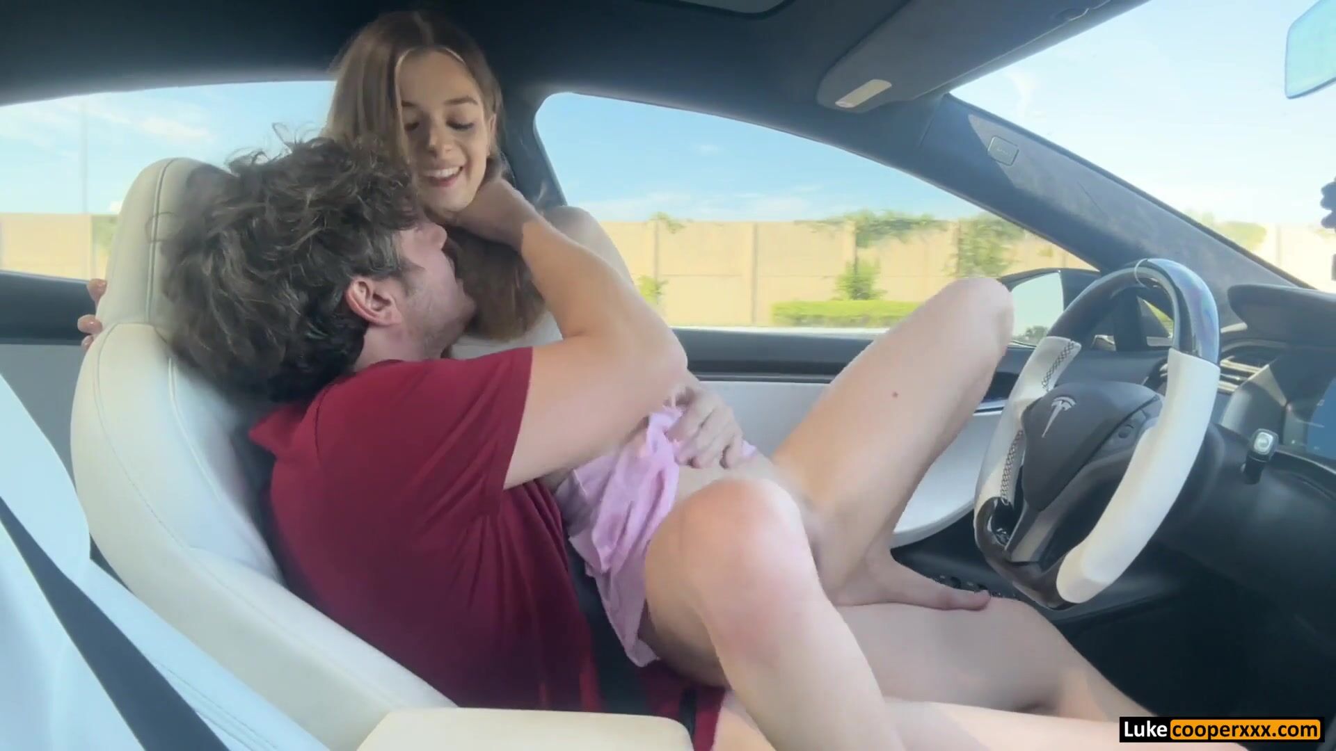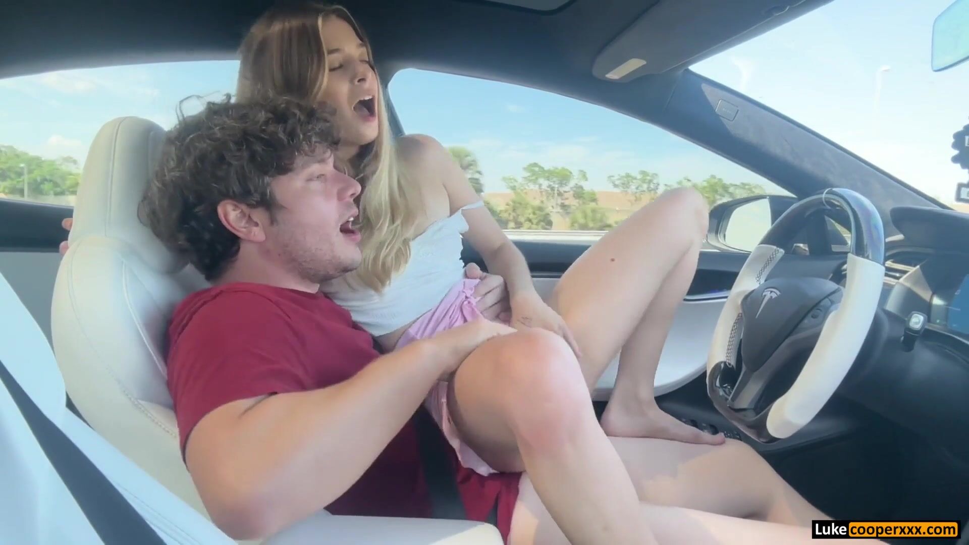 Molly Little rides Luke Cooper in a moving Tesla - Blowjob, Sex, Car, Car Blowjob, Car Sex, Cowgirl, Reverse Cowgirl, Blonde, Blonde Blowjob, Petite, Petite Blowjob, Skirt, Miniskirt, Small Tits, Public, Risky Play