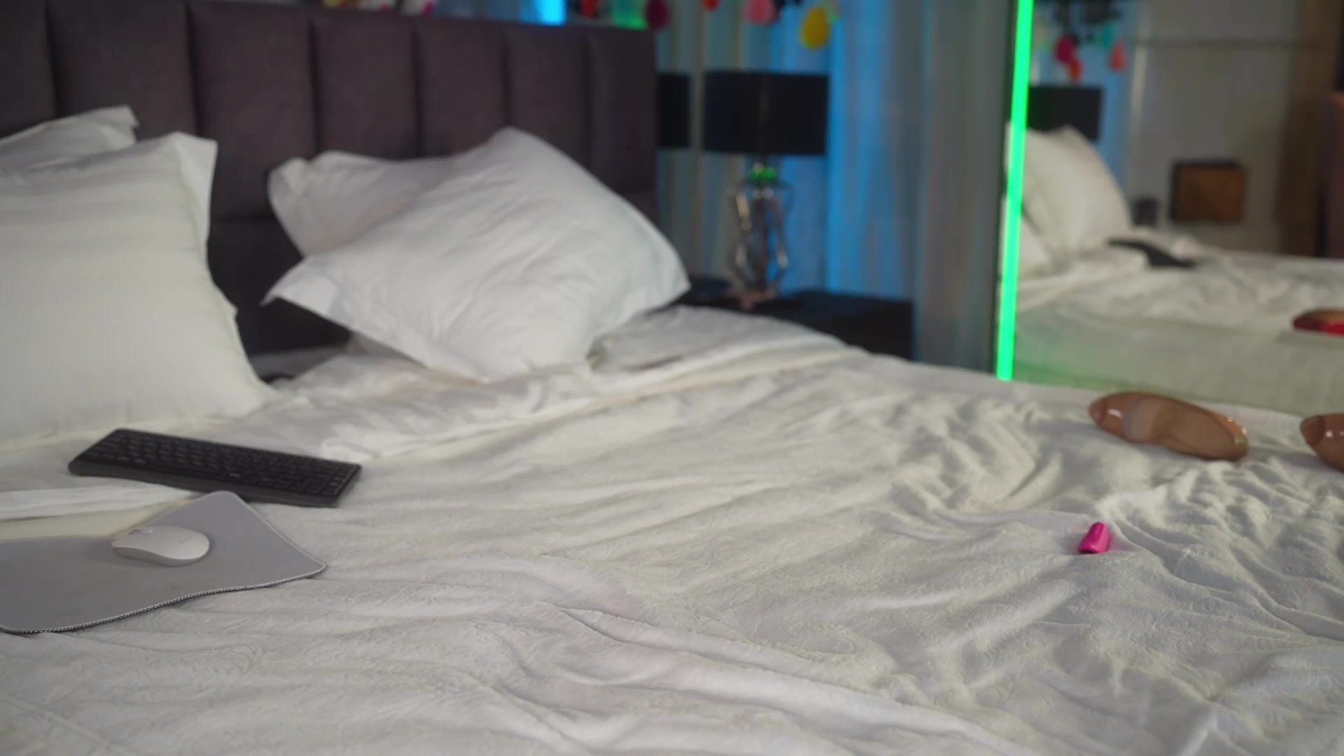 pretty girl is lying in a naked bed doing a stream and she’s masturbating and then starts showing everything and goes teaching and masturbating