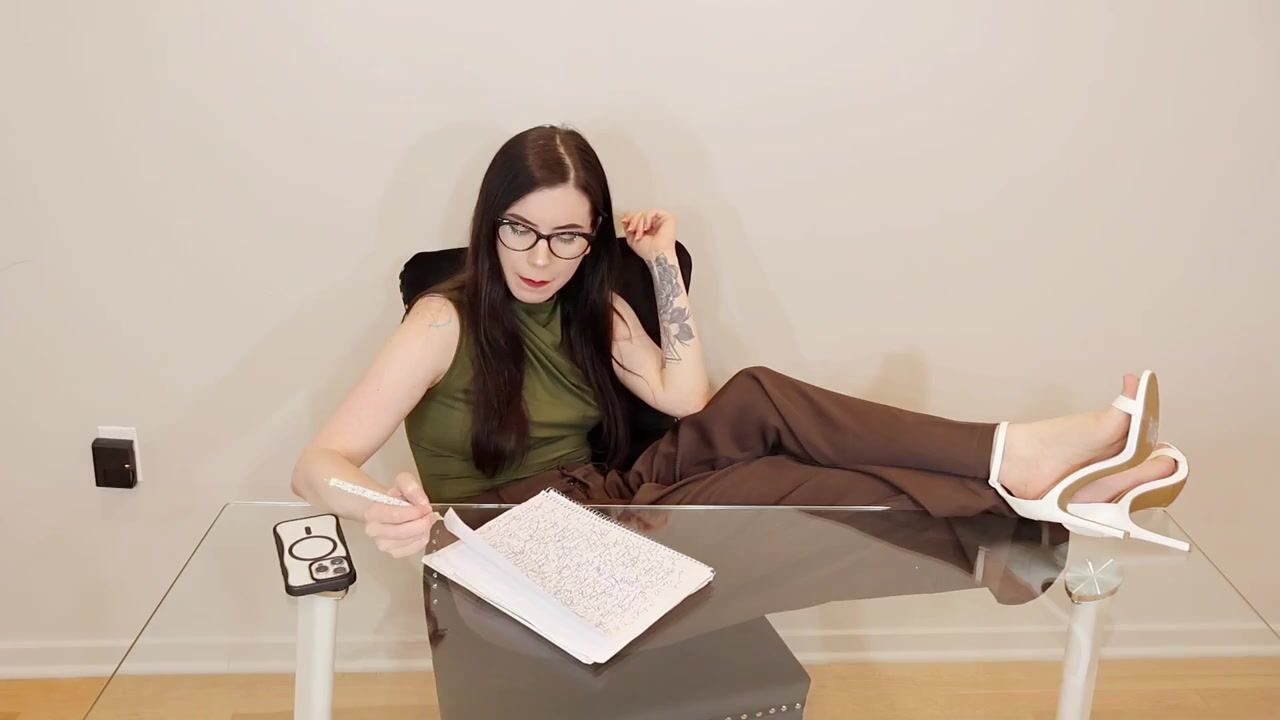 Your boss randomly calls you into her office in the middle of a busy work day. When you walk in you see her with her feet propped up on her desk, writing down notes. When she notices you, she finishes what she is writing and starts with some small talk while also complimenting you any chance she gets.