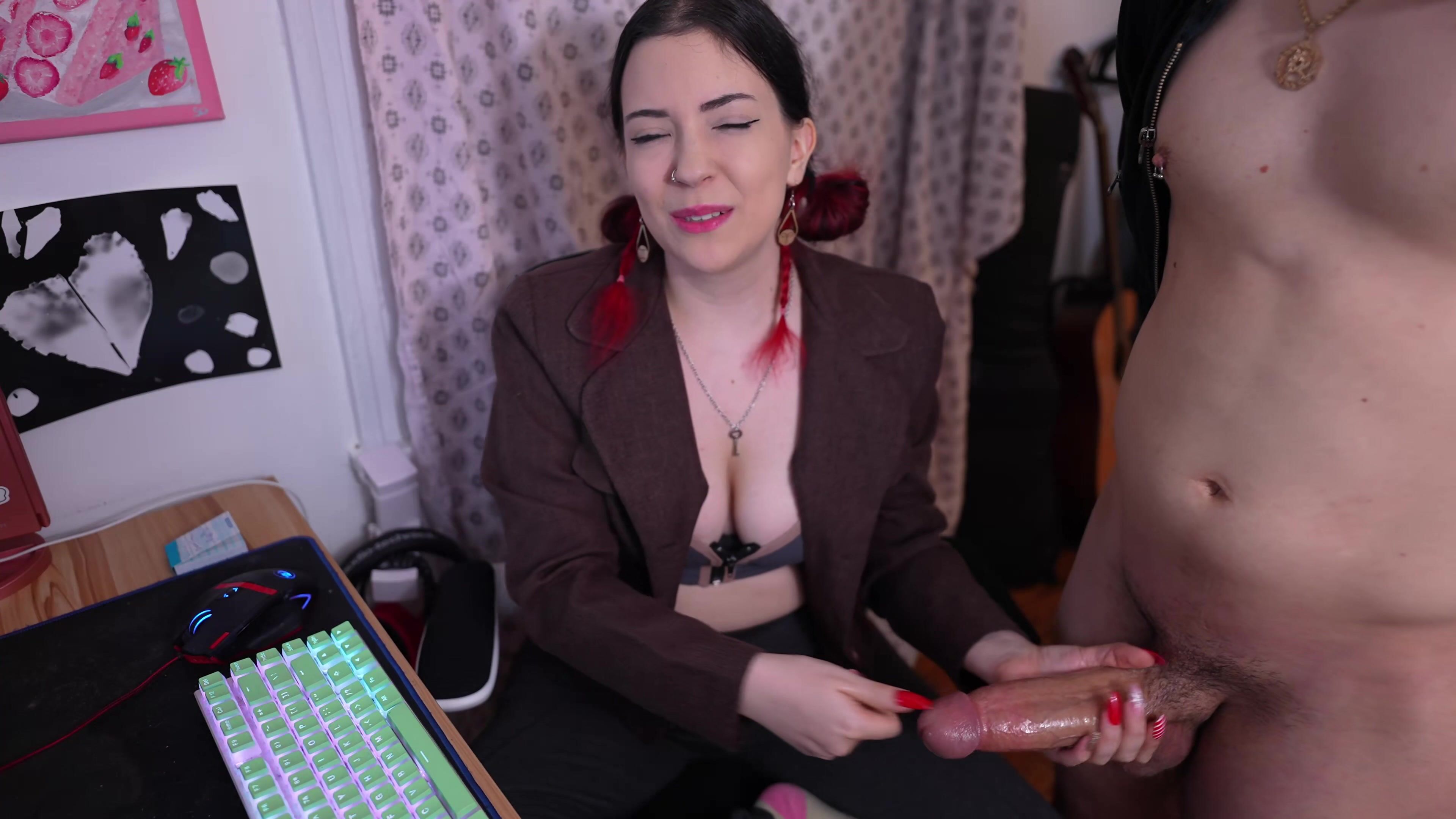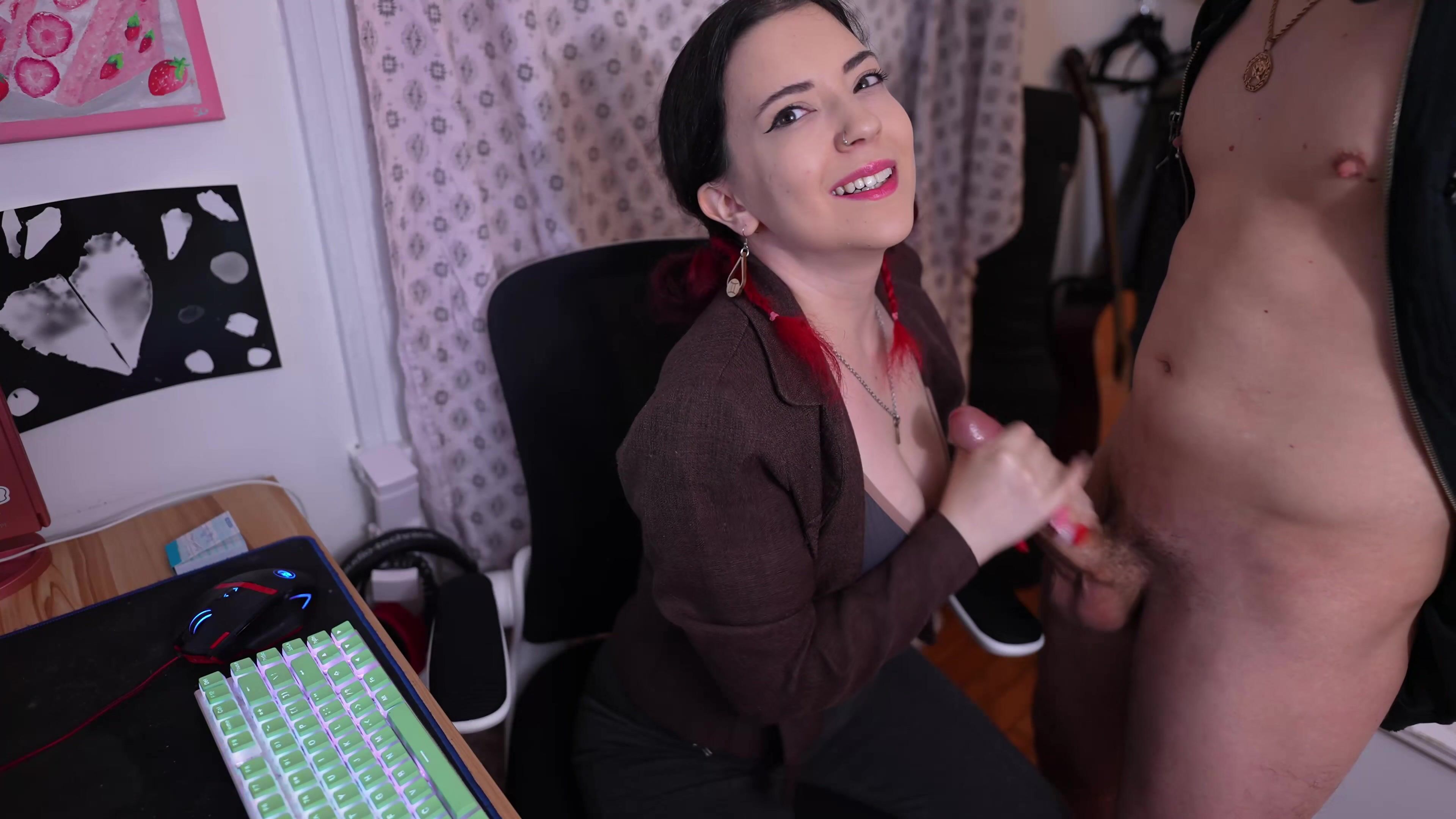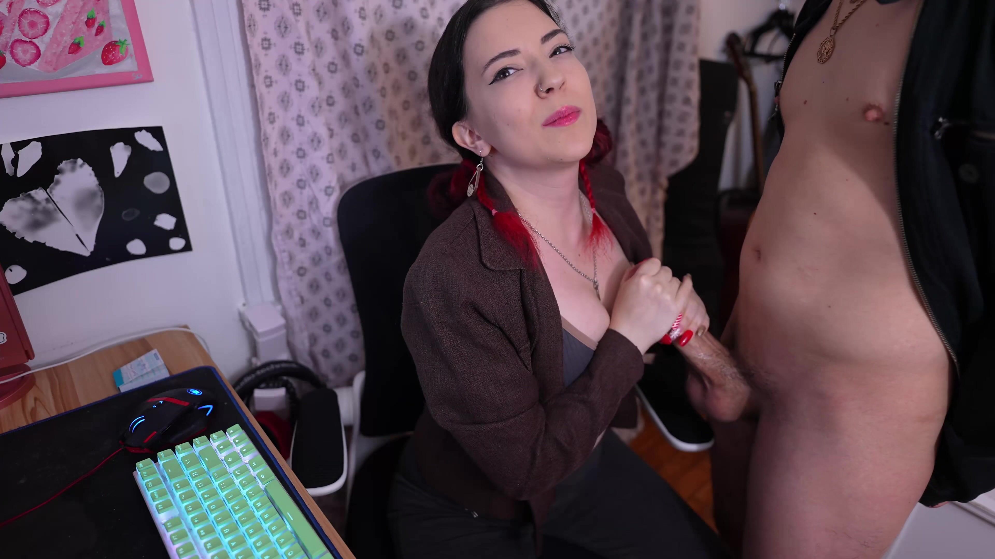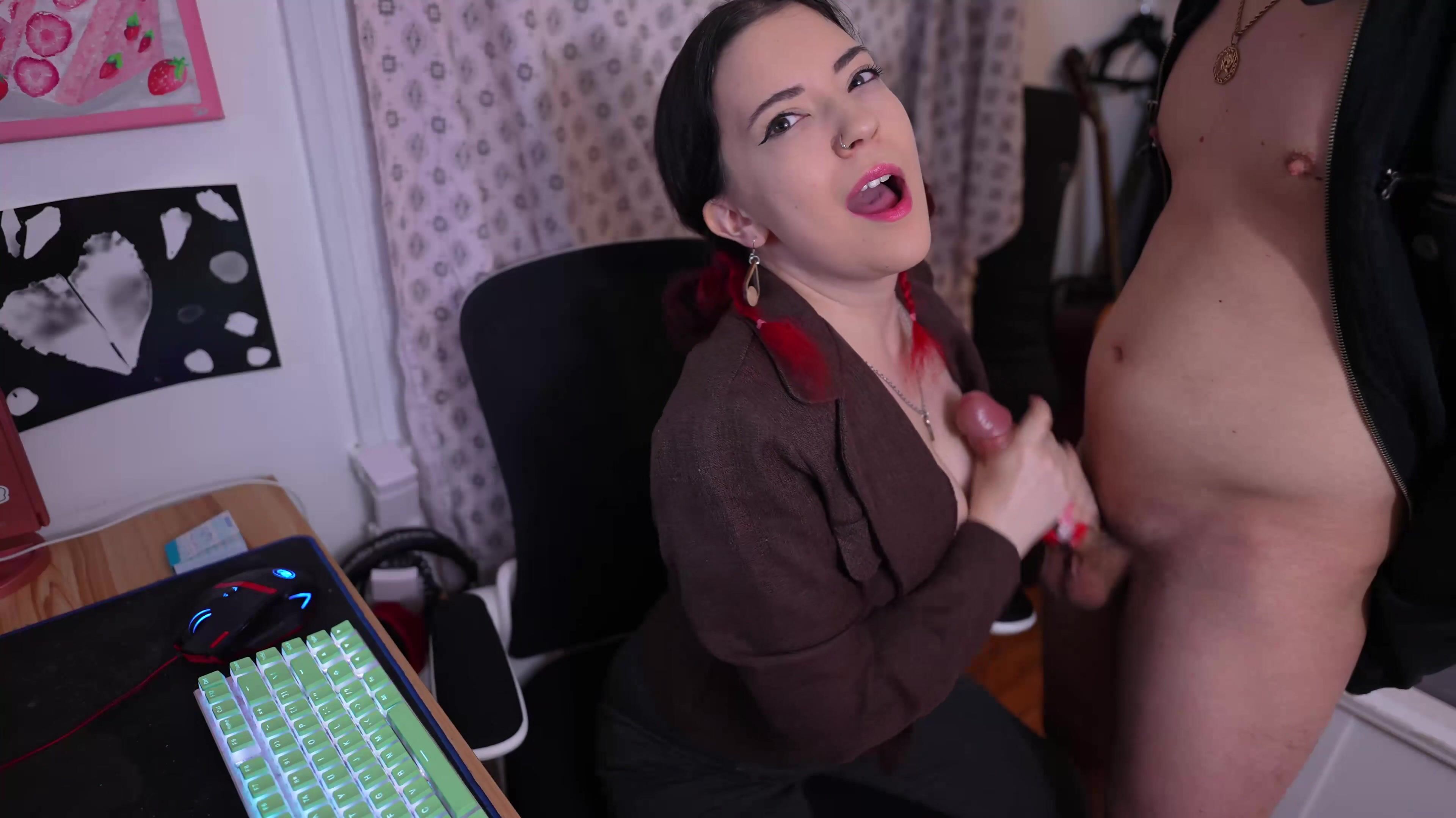 You'll be the office cuck slave! She calls him in and jerks him off while degrading and humiliating you until he cums all over her chest.